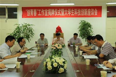 张处长和李院长为创青春工作室揭牌。揭牌仪式结束后,李书记主持召开了大学生科技创新座谈会。李院长详细的介绍了物理与电子工程学院大学生的创新成果并对去年的工作表现和今年的工作规划作了汇报。吴顺伟,封百涛,陈亮等指导老师介绍了项目的进程情况并对同学们给予厚望。参加大学生科技创新比赛的各位同学分享了他们的心得后由张处长做出总结讲话并对物理与电子工程学院工作进行指导。