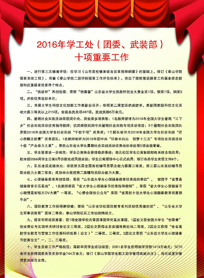 【校园热点】泰山学院2016年学工处(团委、武装部)十项重要工作