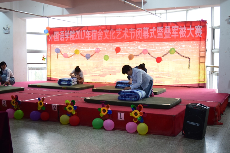 2017年6月6日下午2点30分,外国语学院学生会宿管部在南校图书馆三楼举办了以“走出宿舍,放飞自我”为主题的第十五届宿舍文化艺术节闭幕式暨叠军被大赛。参加本次闭幕式暨叠军被大赛的嘉宾有:团总支副书记王成磊老师、外国语学院辅导员丁丽娜老师、南校助理辅导员宋晓敏学姐、学生会副主席张丛学姐、宿管部部长栾晓林学姐。