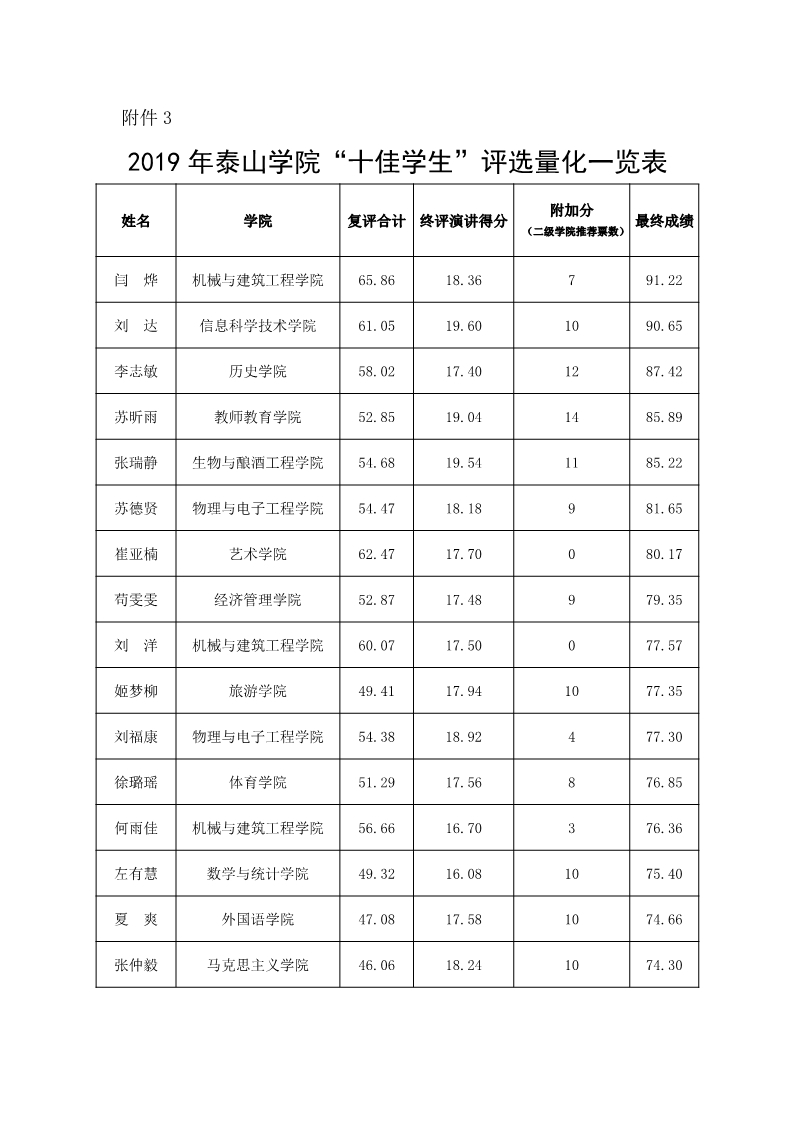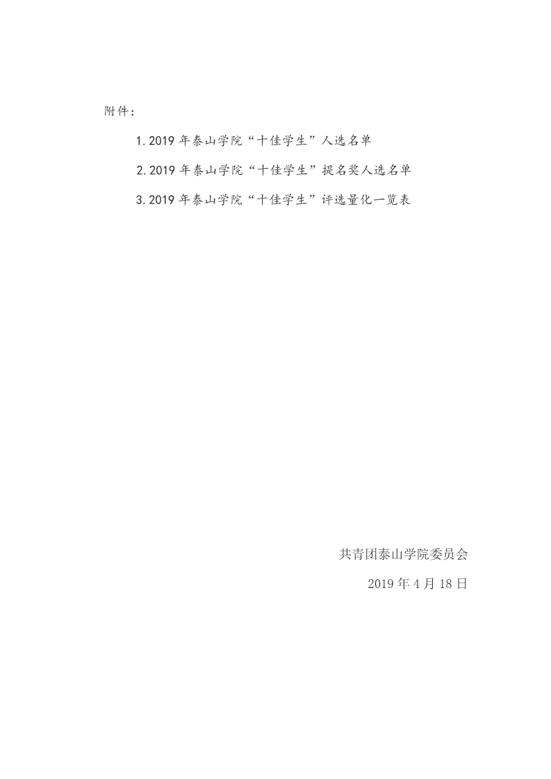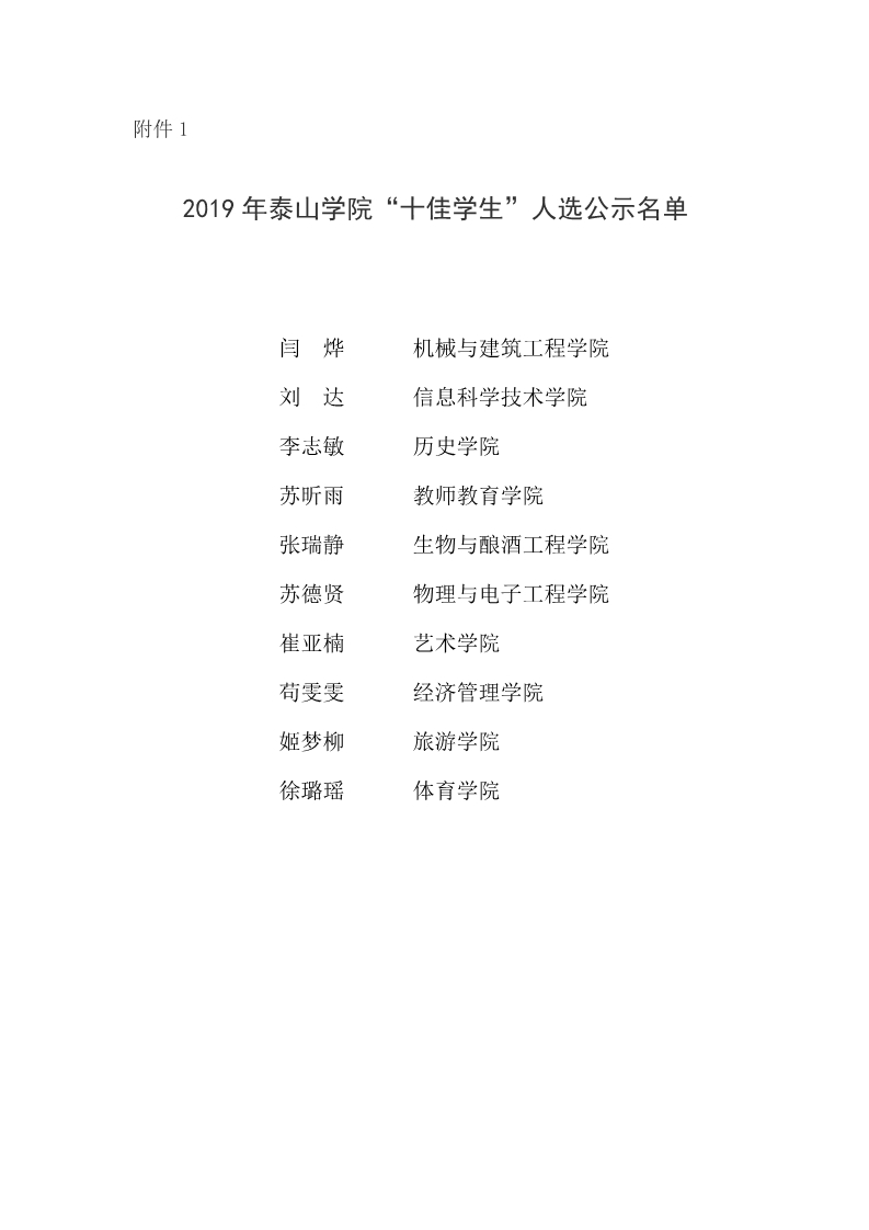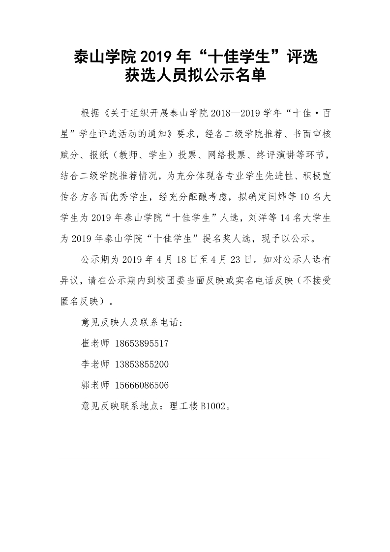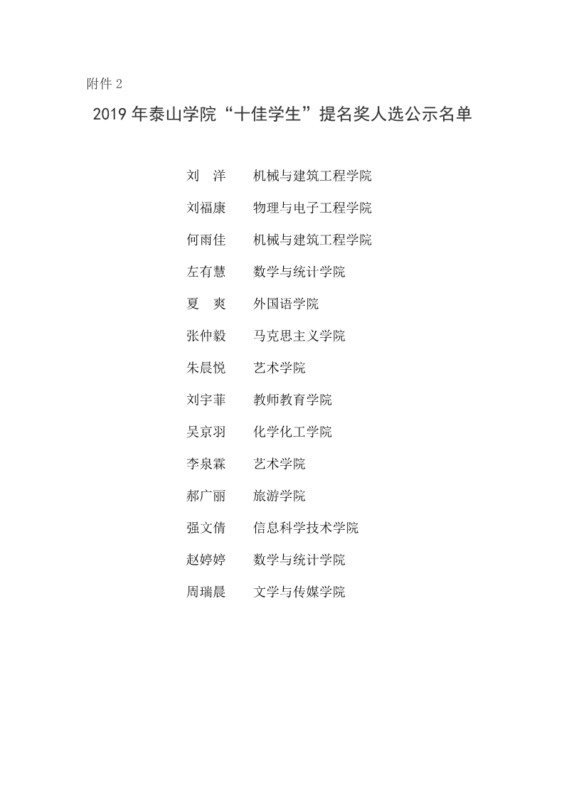 泰山学院 2019 年“十佳学生”评选获选人员拟公示名单