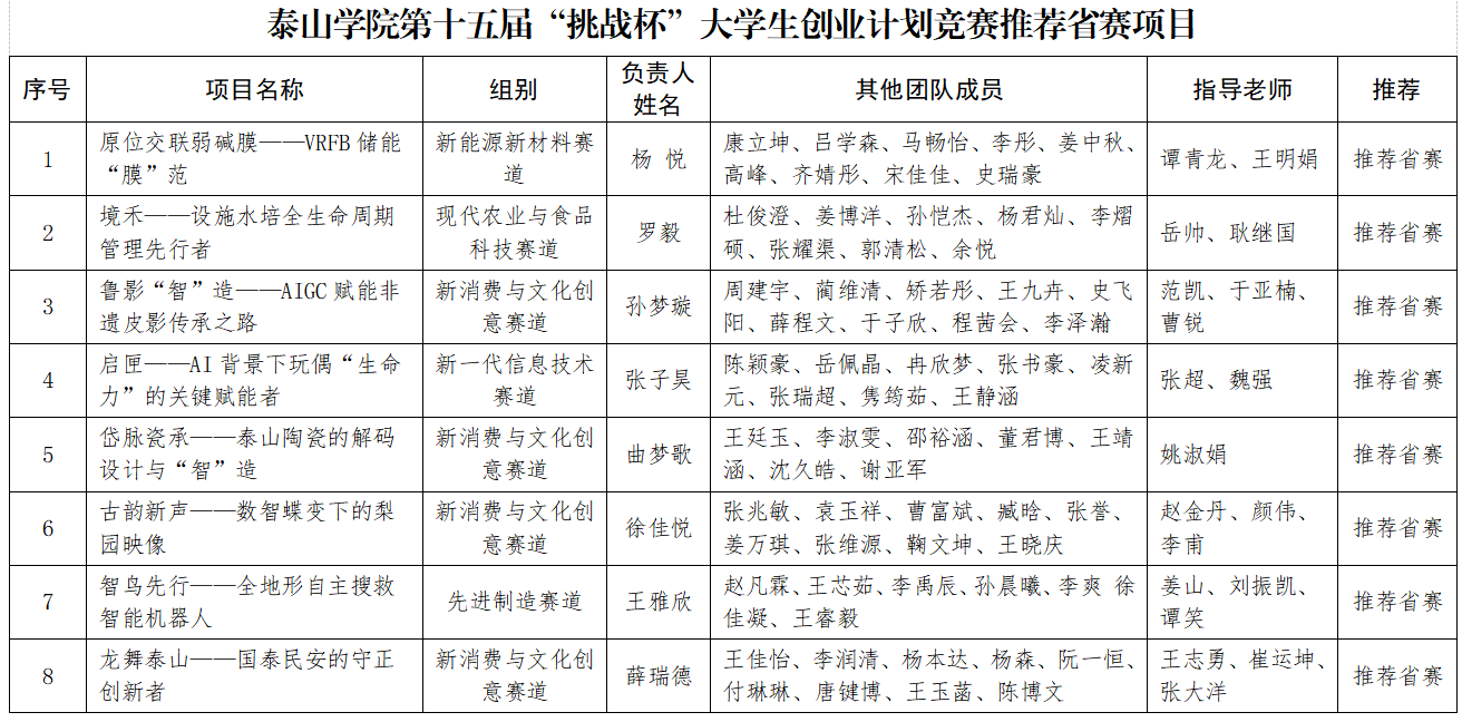 为进一步深化创新创业教育改革,提升学生创新精神、创业意识和实践能力,根据《关于组织开展第十五届“挑战杯”山东省大学生创业计划竞赛校内选拔赛的通知》,学校于2026年4月2日下午举办了第十五届“挑战杯”大学生创业计划竞赛校级选拔赛。历经院赛推荐、校内公开答辩、线上线下专家评审等环节,各 项工作已圆满完成。其中8项作品拟推荐进入省赛(附件1)。