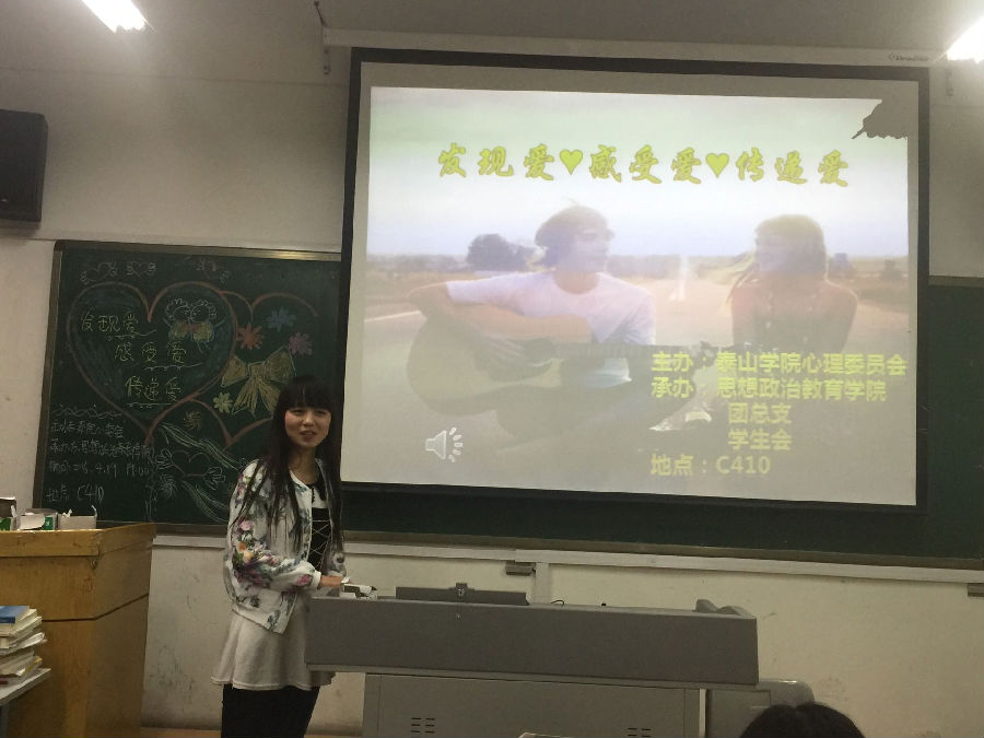 4月19日晚7点,思想政治教育学院在南校区综合楼C410举行主题为“发现爱,感受爱,传递爱--爱心大家谈”心理班会。本次班会由心理部张美龄主持,2015级全体学生参加本次班会。