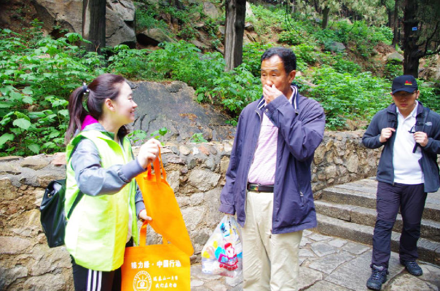 泰山学院大学生记者团联合泰安公益志愿者协会泰山学院分会组织60多名志愿者,汇聚在登泰山游人最集中的红门景区,捡拾白色垃圾,免费向游客发放环保垃圾袋并向游客宣传环保知识,倡导游客带垃圾下山。