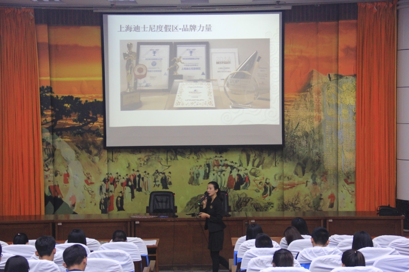 4月25日下午,上海迪士尼招聘团队在我校国际交流中心报告厅为旅游学院2015级全体学生作了“主题公园与迪士尼文化”的专题报告。旅游学院主要负责人、部分专业教师和辅导员参加了报告会。