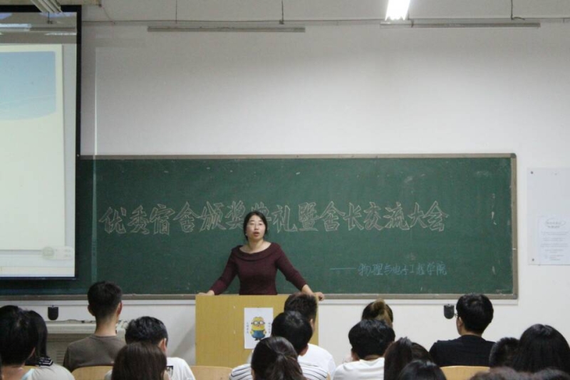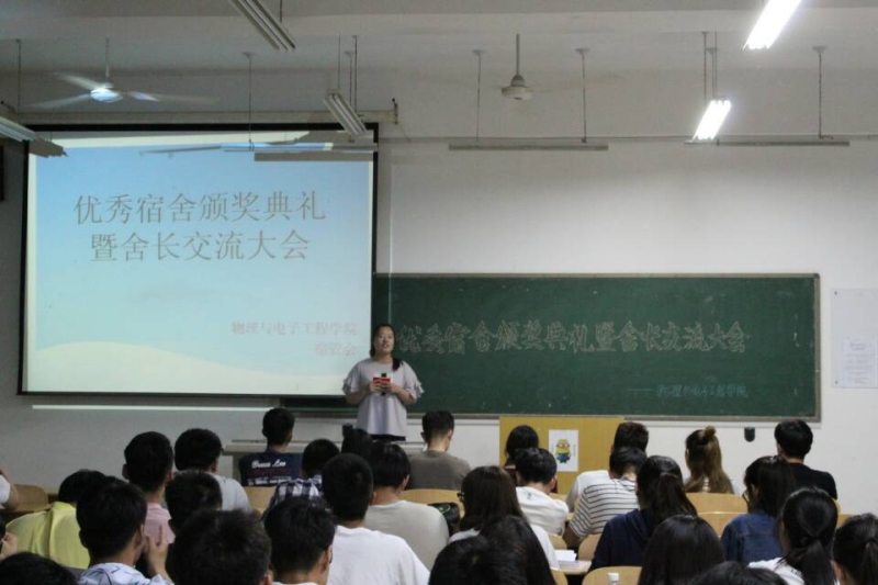 5月12日晚上7:30,物理与电子工程学院在二号综合楼A3009召开了“优秀宿舍颁奖典礼暨舍长交流大会”。本次会议旨在通过对本学期宿舍卫生成绩的评比分别对优秀宿舍颁奖,并通过各舍长之间的交流增进同学们之间的感情。会议由宿管安全部副部长徐琛同学主持,物理与电子工程学院团总支辅导员刘明琦老师以及各宿舍舍长参加了此次大会。
