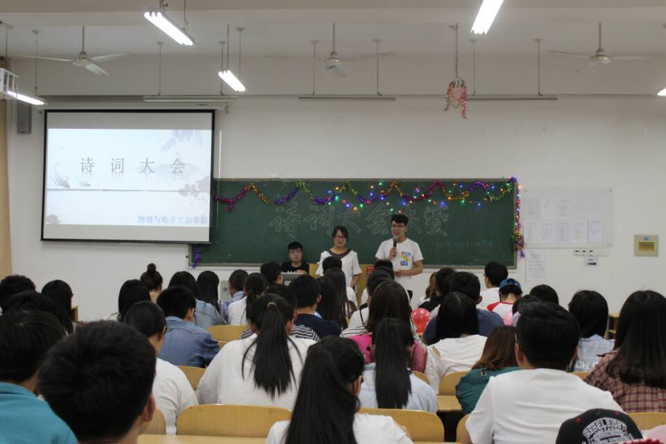 5月14日,物理与电子工程学院在二号综合楼A3002圆满举办了“诗词大会决赛”。本次比赛旨在选举诗词达人代表该院参加学校的诗词大会,本次决赛由物理与电子工程学院16级学生于清泉,马宇璐主持,该院学生会主席团部分代表出席了本次大会,经过初赛、复赛脱颖而出的二十名同学齐聚决赛现场,并有亲友团前来加油助威。