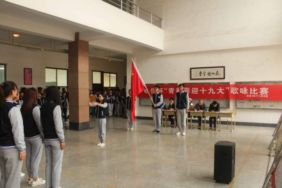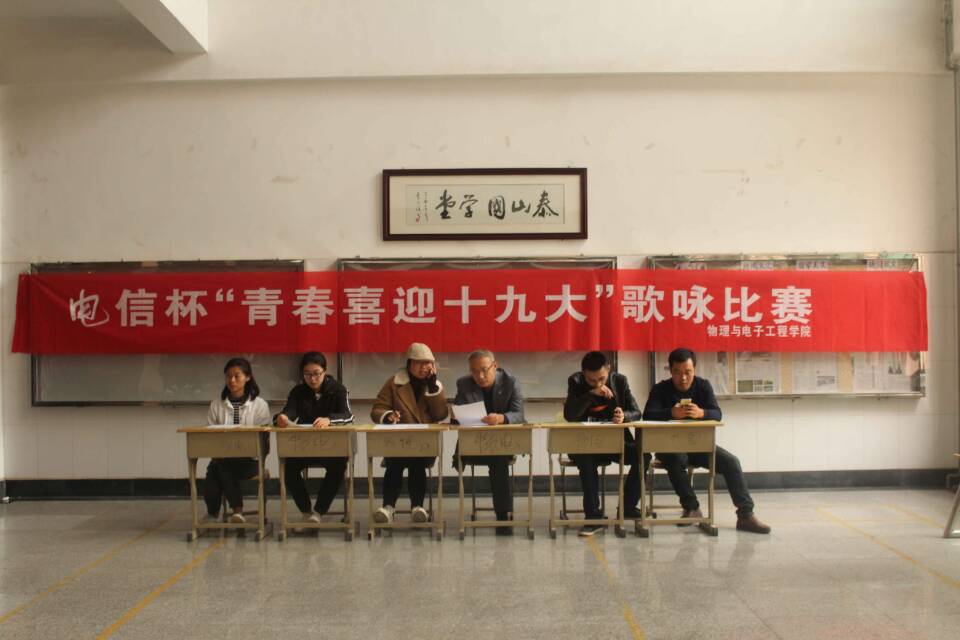 10月17日下午,物理与电子工程学院在二号综合楼三楼大厅成功举办了电信杯“青春喜迎十九大”歌咏比赛。本次活动旨在鼓舞同学们弘扬爱国精神,唱响社会主义核心价值观,以浓厚喜庆的氛围迎接十九大的胜利召开。该院党总支书记李春海老师,团总支辅导员刘明琦老师和胡适老师及电信公司负责人吴经理出席并担任本次比赛的评委老师。物理与电子工程学院2016级部分班级和2017级各班参加了此次比赛。