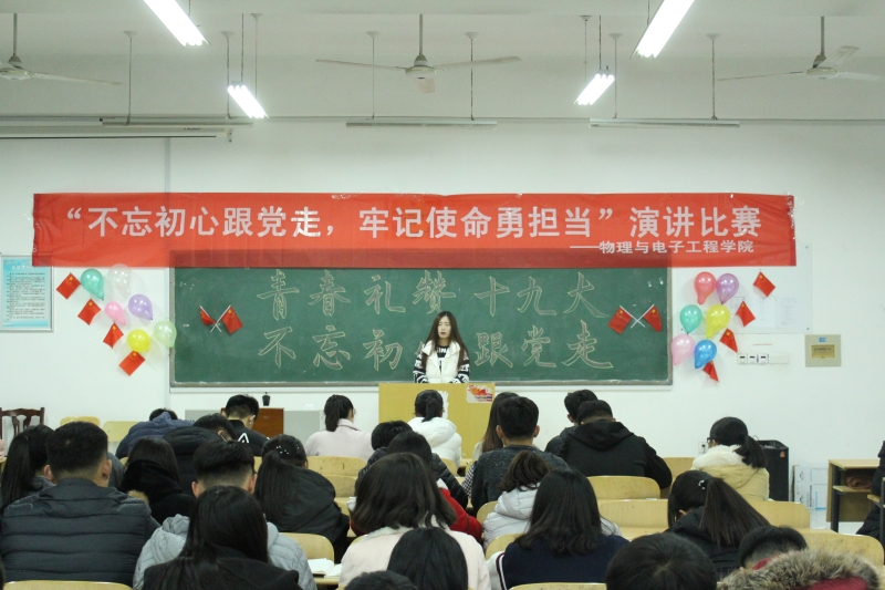 根据学校团委文件要求,为鼓舞同学们深入学习贯彻党的十九大精神,践行社会主义核心价值观,11月19日晚,物理与电子工程学院在二号综合楼A3010成功举办“不忘初心跟党走,牢记使命勇担当”主题演讲比赛预赛。本次比赛由该院学生会主席团的部分成员担任评委,由2016级通信工程一班的马宇璐同学主持,该院各班级共25名同学积极参加了本次比赛。